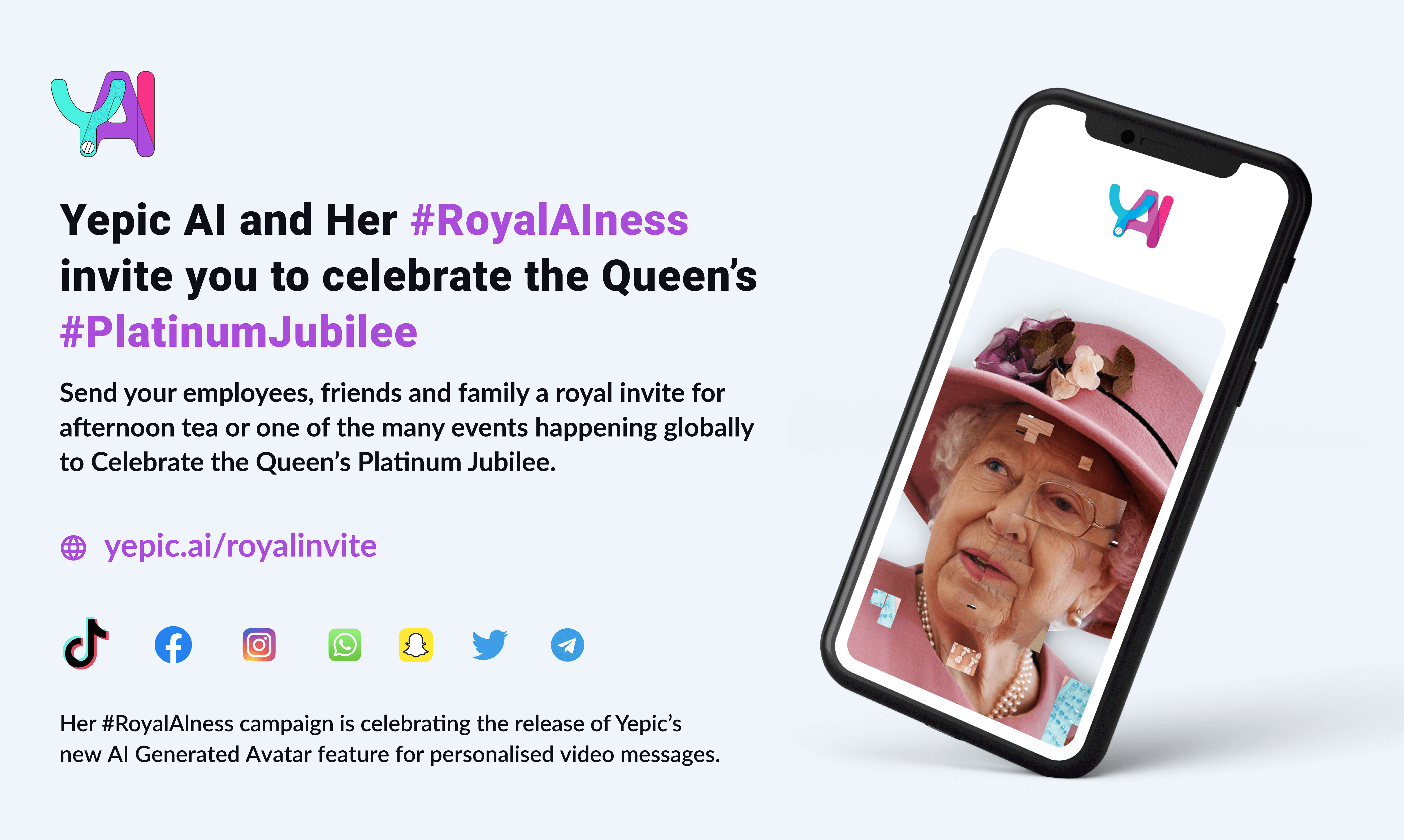 Yepic.ai, a video messaging startup based in London, UK, are celebrating the #PlatinumJubilee with a #RoyalAIness campaign to announce the launch of our new AI Generated Avatar Studio.